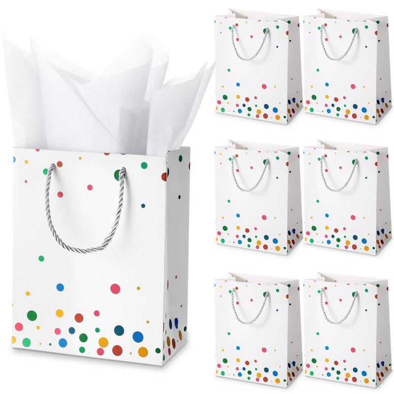 - Sufficient Quantity: the gift bags set contains 6 pcs colorful polka dots gift bags and 6 sheets of white tissue paper; Each bag is accompanied by white tissue paper, offering an ample variety to suit your specific gift wrapping requirements; Our medium gift bag set is the ideal solution for Easter gifts, birthday gifts, wrapping gifts, wedding, shopping, parties, graduation party, Mother's Day, etc