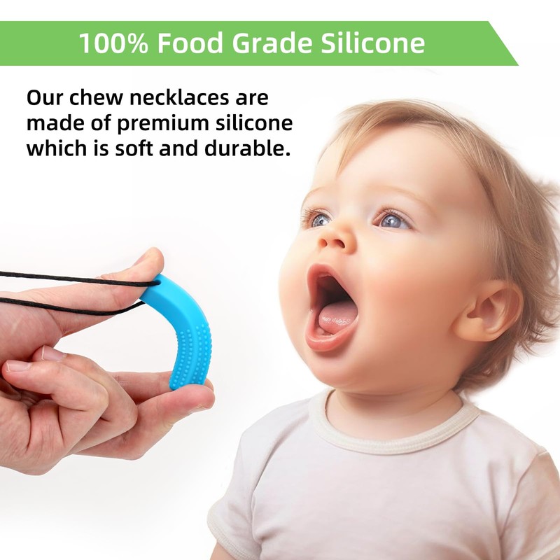 - Sicheres Material - Unsere sensorischen Kauhalsbänder für autistische Kinder sind aus Silikon gefertigt. Alle unsere Kauketten für Oralmotoren wurden auf 100% Lebensmittelsicherheit geprüft und sind BPA-frei, PVC-frei, bleifrei und phthalatfrei