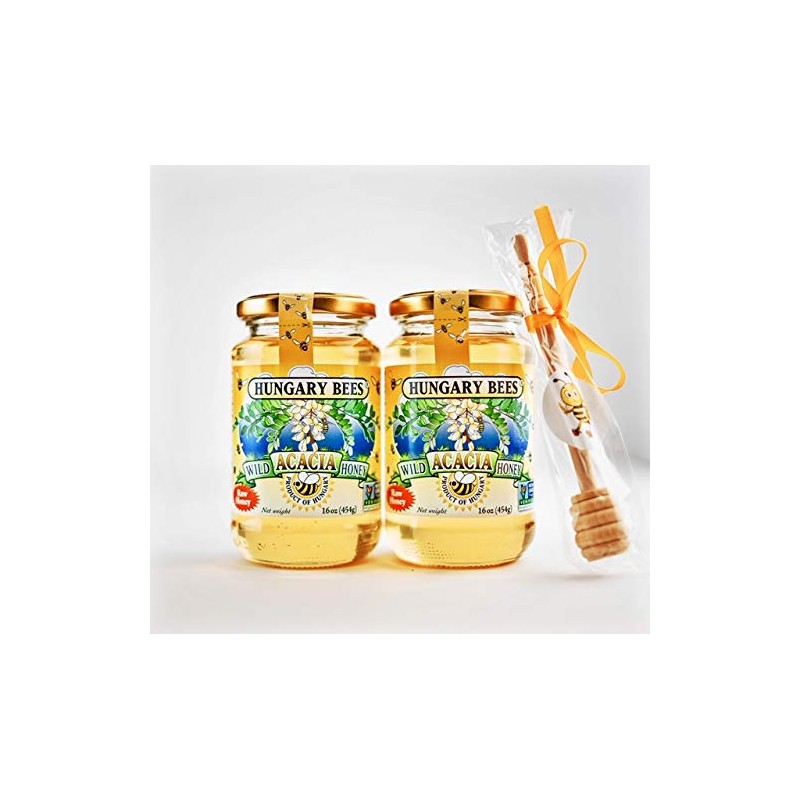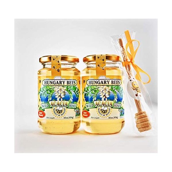 Hungary Bees Wild Acacia Honey 16oz - 2 Pack with free honey dipper stick