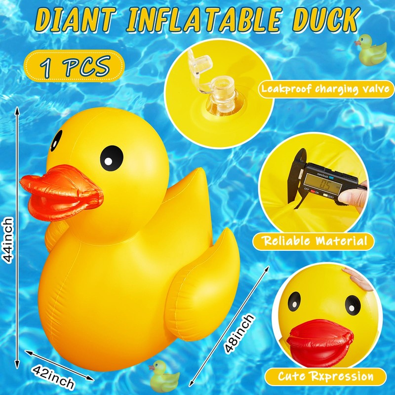- Large Fun Sized Duck: this giant inflatable duck stretches to a whopping about 4ft in length, 44 inches in height and 42 inches in width, promising more fun and easy satisfaction for your gaming and party decoration needs; Add a little water to its base, and enjoy a delightful pool time; The size and weight of the duck is large, so there needs to be enough water in the pool for the duck to float properly