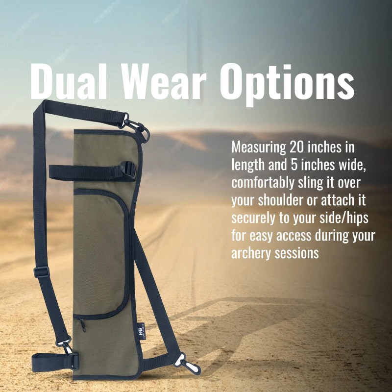 Dual Wear Options: Measuring 20 inches in length and 5 inches wide, comfortably sling it over your shoulder or attach it securely to your side/hips for easy access during your archery sessions.