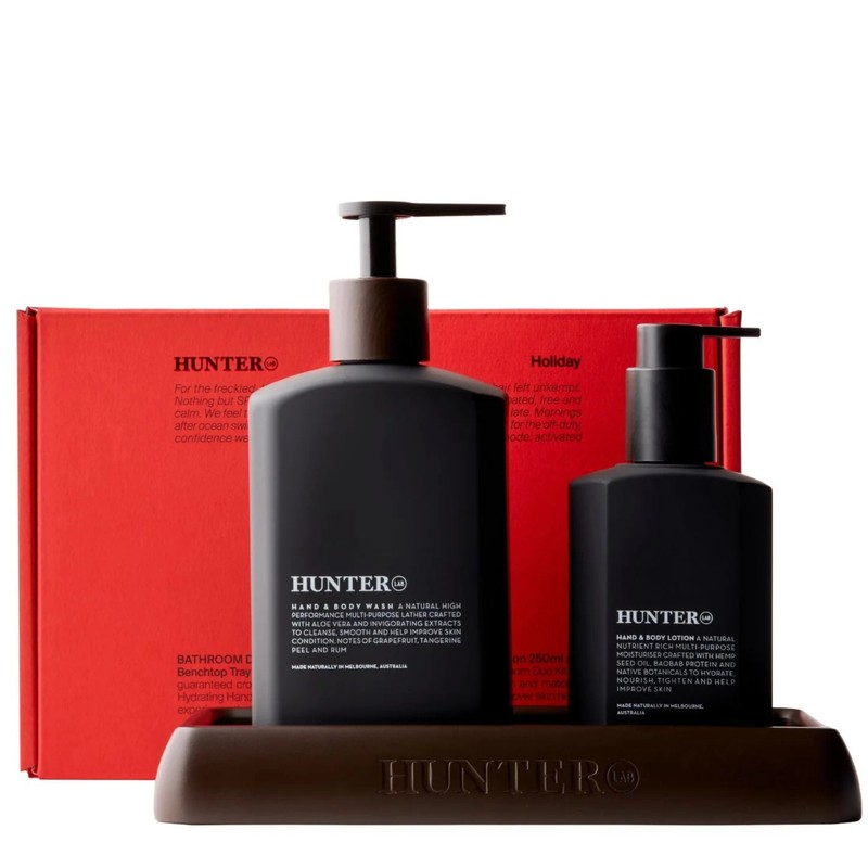 The Hunter Lab Benchtop Duo Kit is the ultimate gift for luxurious, everyday skin care. This set features Hunter Lab's signature Hand & Body Wash and Hydrating Hand & Body Lotion. It's designed to pamper your skin and delight the senses with its smooth texture and irresistible fragrance, making it perfect for yourself, someone special, or both. What is included in Hunter Lab Benchtop Duo Kit? • Hand & Body Wash • Hydrating Hand & Body Lotion • Chocolate resin benchtop tray What are the features and benefits of Hunter Lab Bench Top Duo Kit? Hand & Body Wash: This wash is formulated to cleanse and refresh the skin, leaving it feeling soft and rejuvenated with a subtle, pleasant fragrance. Hydrating Hand & Body Lotion: This lotion deeply moisturizes and nourishes the skin, providing long-lasting hydration and a silky-smooth finish. Who is Hunter Lab Benchtop Duo Kit for? This product is for anyone seeking a luxurious and effective skincare routine that pampers and delights the senses.
