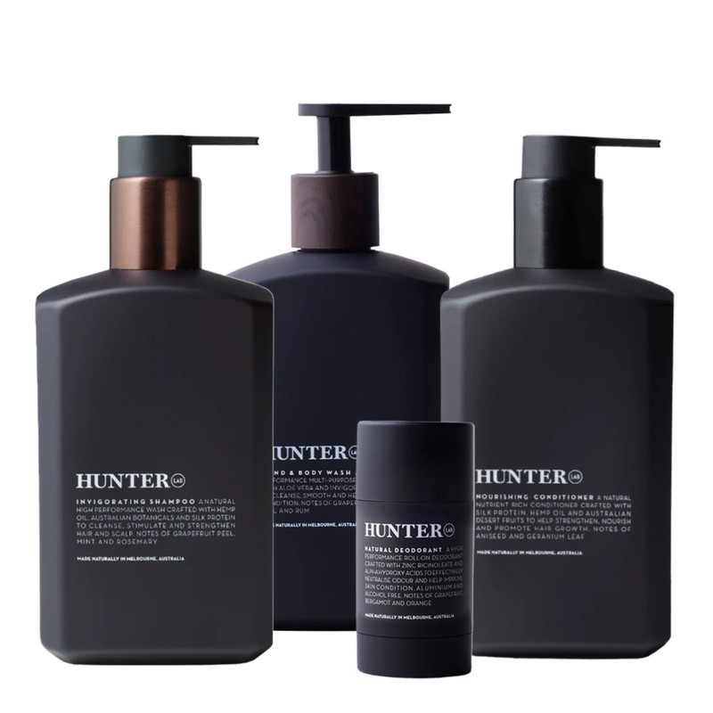 The Hunter Lab Hair & Body Bundle is a comprehensive grooming set designed to elevate your daily routine with premium, natural ingredients. This bundle combines four essential grooming products, each crafted with a focus on natural, high-quality ingredients to provide a luxurious and effective personal care experience. The Invigorating Shampoo and Nourishing Conditioner work together to cleanse and hydrate your hair, leaving it feeling refreshed and revitalized. The Hand & Body Wash offers a gentle yet thorough cleanse for your skin, while the Natural Deodorant ensures long-lasting freshness throughout the day. Perfect for those who value quality and sustainability in their grooming products, the Hunter Lab Hair & Body Bundle is a must-have for a complete grooming regimen. What is included in Hunter Lab Hair & Body Bundle? • Invigorating Shampoo 550ml • Nourishing Conditioner 550ml • Hand & Body Wash 550ml • Natural Deodorant 50g What are the features and benefits of Hunter Lab Hair & Body Bundle? Invigorating Shampoo: This shampoo is formulated with natural ingredients to cleanse and invigorate your hair, promoting a healthy scalp and leaving your hair feeling fresh and full of life. Nourishing Conditioner: Enriched with nourishing botanicals, this conditioner hydrates and strengthens your hair, making it smooth, manageable, and resilient against daily stressors. Hand & Body Wash: A gentle cleanser that effectively removes impurities while maintaining the skin's natural moisture balance, leaving your skin feeling soft and rejuvenated. Natural Deodorant: Made with natural ingredients, this deodorant provides effective odor protection without the use of harsh chemicals, ensuring you stay fresh and confident all day long. Who is Hunter Lab Hair & Body Bundle for? This bundle is perfect for individuals who seek high-quality, natural grooming products that deliver effective results while being gentle on the skin and hair.
