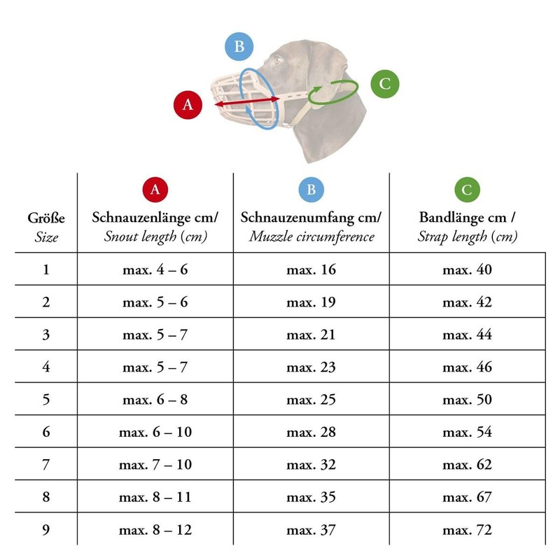 - Strap length: max. 44 cm, snout length max. 5 - 7 cm, snout circumference max. 21 cm