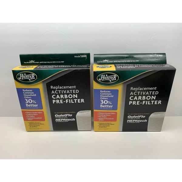 This is a set of 2 Hunter activated carbon pre filters in new condition. Model number is 30901. Please see photos.