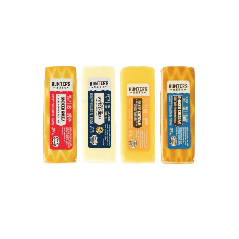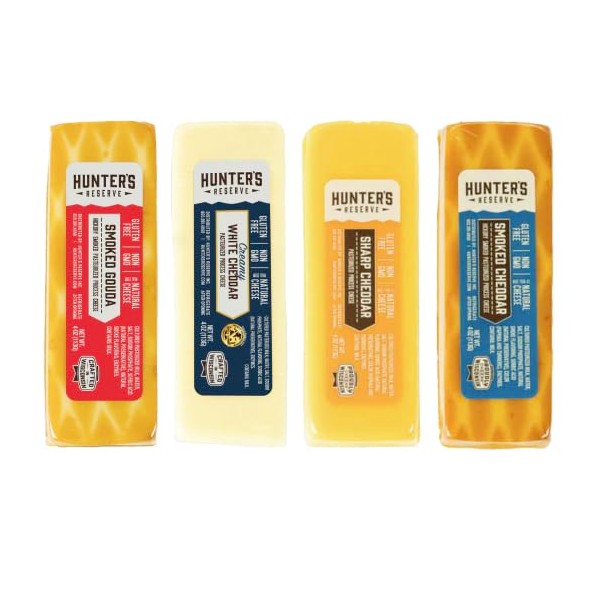 HUNTERS RESERVE - Cheese Bar Assortment 4oz - 4PC Variety Pack CREAMY WHITE CHEDDAR - SMOKED CHEDDAR - SHARP CHEDDAR - SMOKED GOUDA
