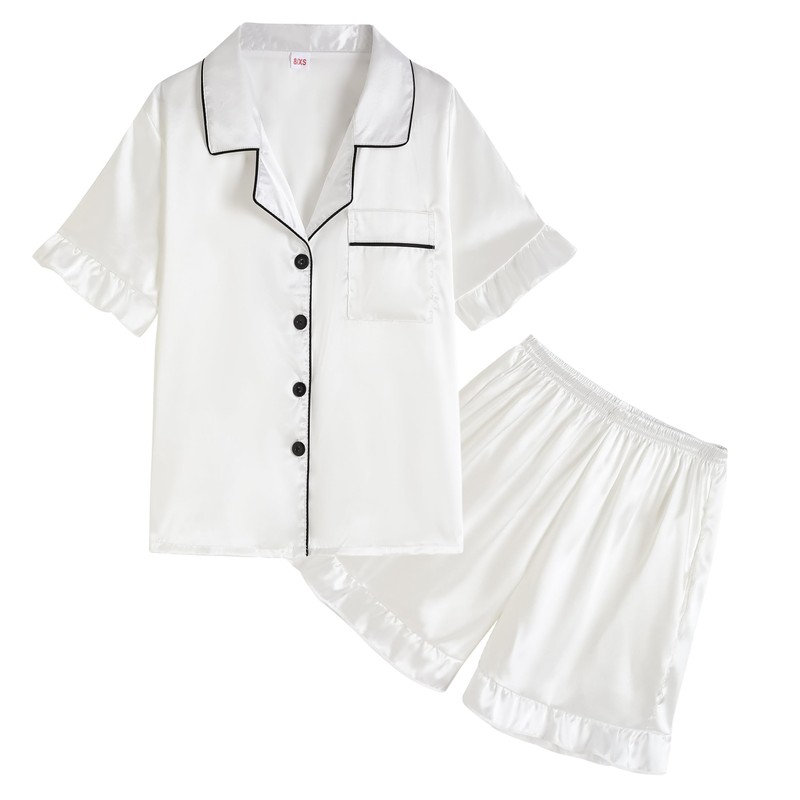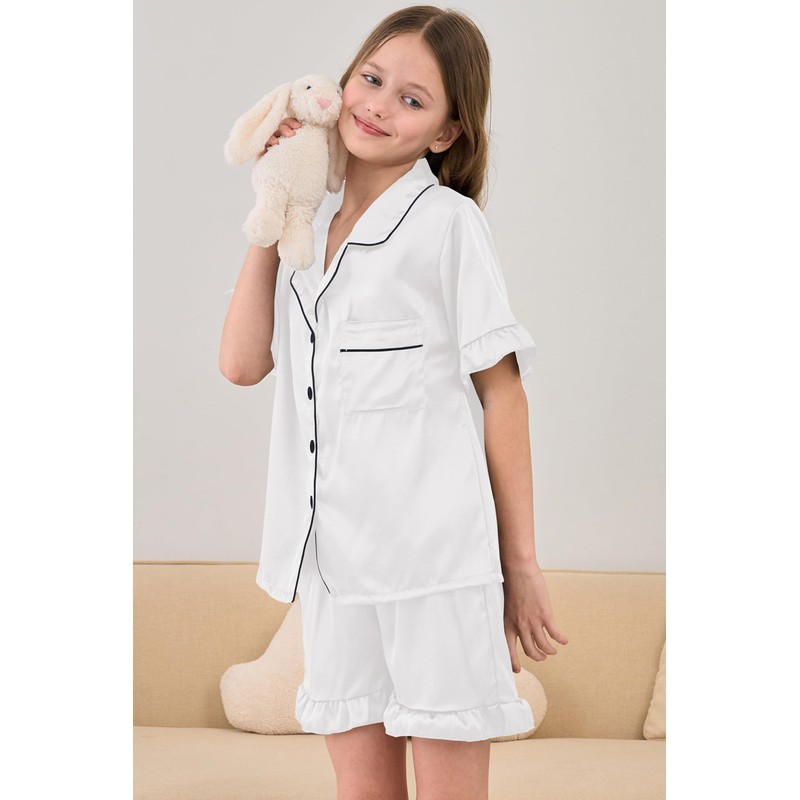 Hupohoi Summer Satin Pajama 2 Pieces Ruffles Sleeve Shorts Loung Sets Button Down Sleepwear for Teen Girls with Pockets, White, 12