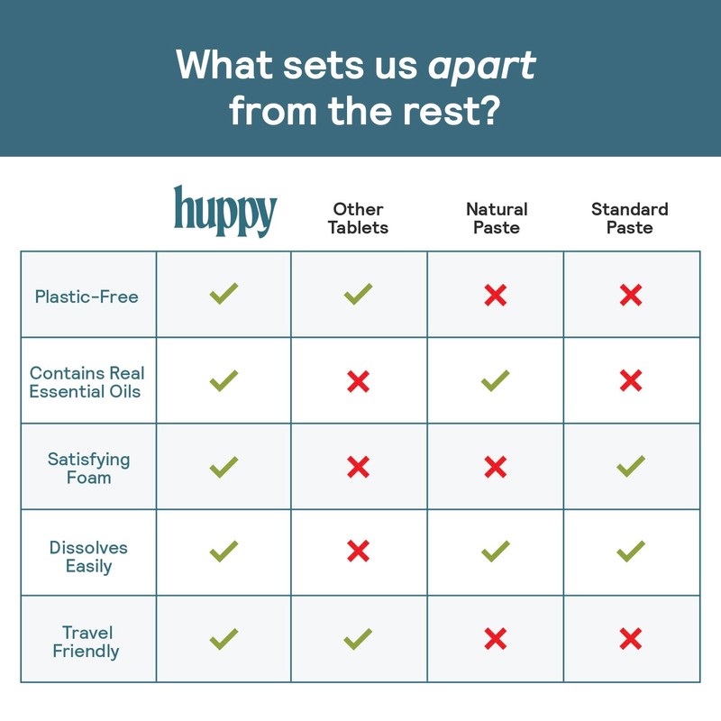 - BRIGHTEN & WHITEN YOUR SMILE: Huppy Toothpaste Tablets offer a blend of clean ingredients that will brighten and whiten your smile. Ingredients such as N-HA to keep teeth safe from decay, xylitol to ward off unwelcome bacteria and coconut oil to keep your gums happy and healthy.