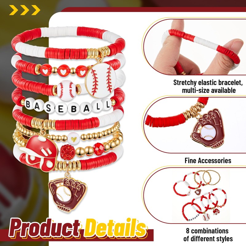 - Baseball Bracelets: package Included 8 strands of bohemian baseball clay bracelets in red and white; You can show off your team style with this clay beaded stretch bracelet