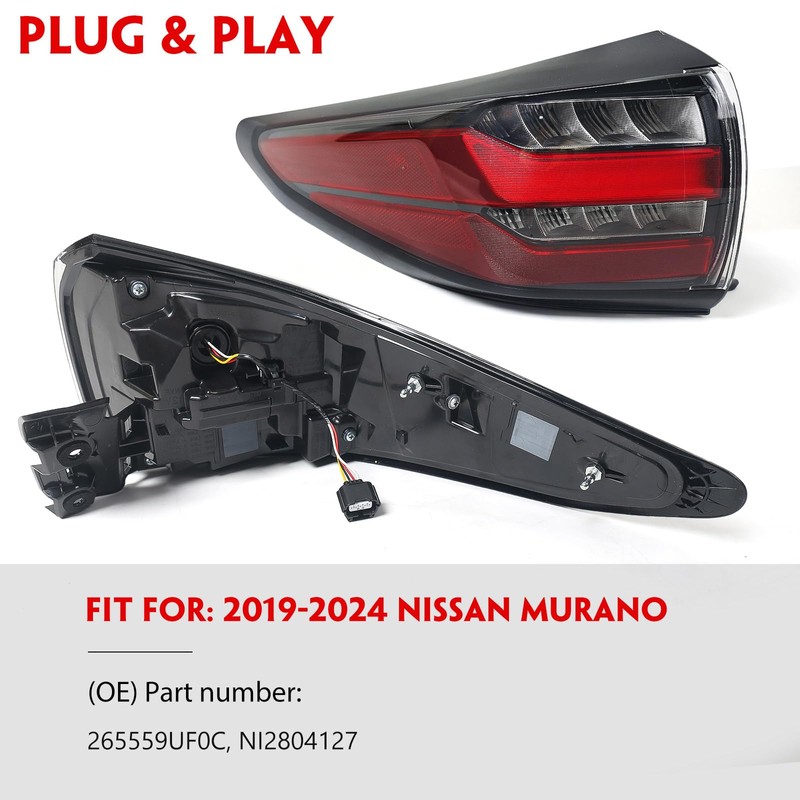 - [OE REPLACEMENT] OE Replacement, Perfectly Fit Your Murano. Reference Part Number: 265559UF0C, NI2804127. Place on vehicle: Driver Side (Left); Lens: Clear & Red Lens, Bulb Type: LED.