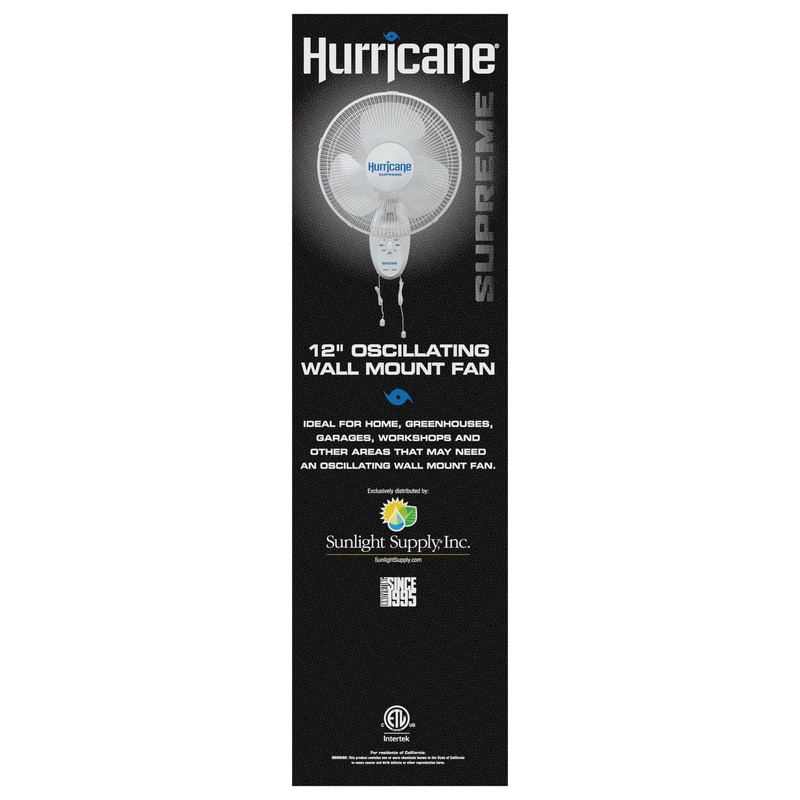 - The Hurricane Supreme 12 inch Oscillating Wall Mount Fan is ideal for homes, greenhouses, garages, workshops and other areas with limited floor space; offers 3 speed modes and may be set in side-to-side oscillation or a static locked position.Voltage:120 volts.Number of speeds:3