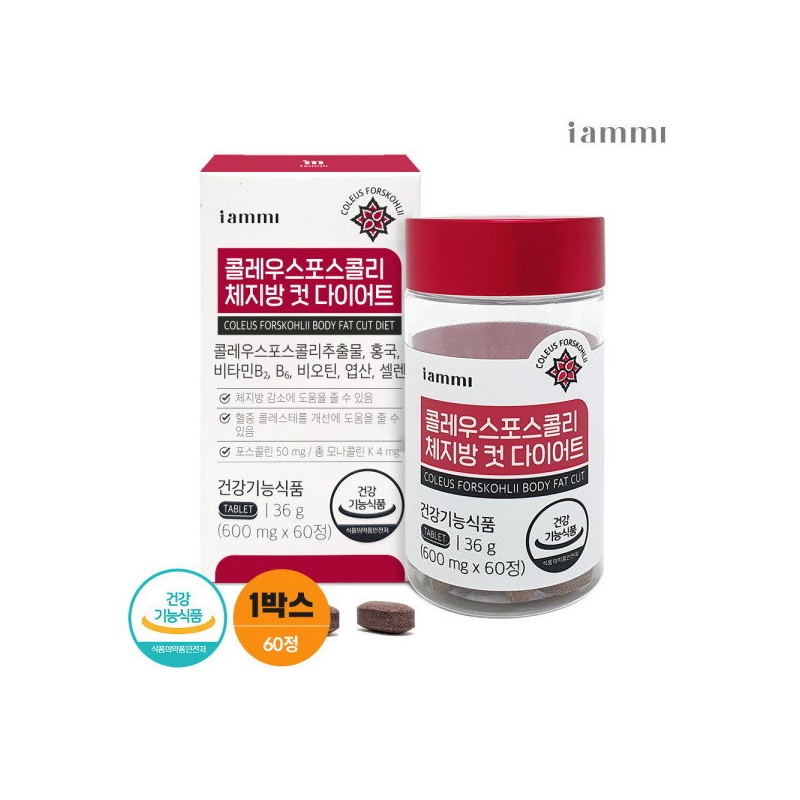 - 기능정보: [콜레우스 포스콜리 추출물] - 체지방 감소에 도움을 줄 수 있음 [비타민B₁] - 탄수화물과 에너지 대사에 필요 [비타민B₂] - 체내 에너지 생성에 필요 [판토텐산] - 지방, 탄수화물, 단백질 대사와 에너지 생성에 필요 [비타민B6] - 단백질 및 아미노산 이용에 필요 - 혈액의 호모시스테인 수준을 정상으로 유지하는데 필요 [셀레늄] - 유해산소로부터 세포를 보호하는데 필요