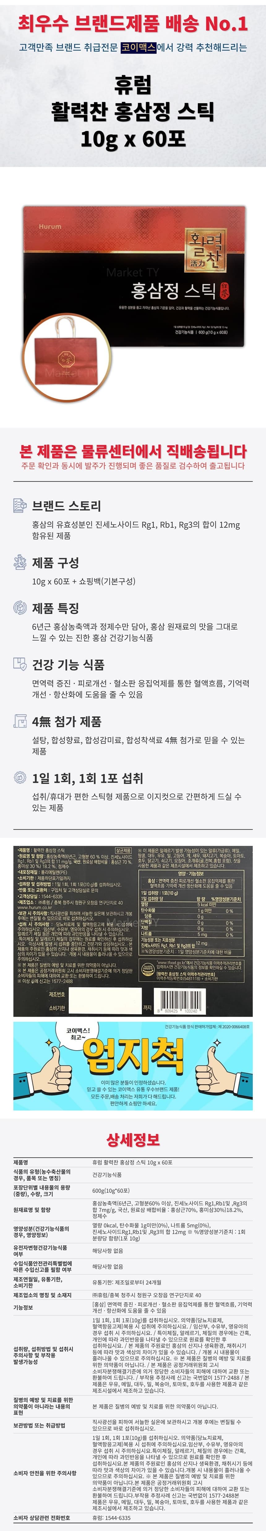 Hurum Vibrant Red Ginseng Sticks 10g x 60 Pieces - Single / 휴럼 활력찬 홍삼정 스틱 10g x 60개입 - 단일