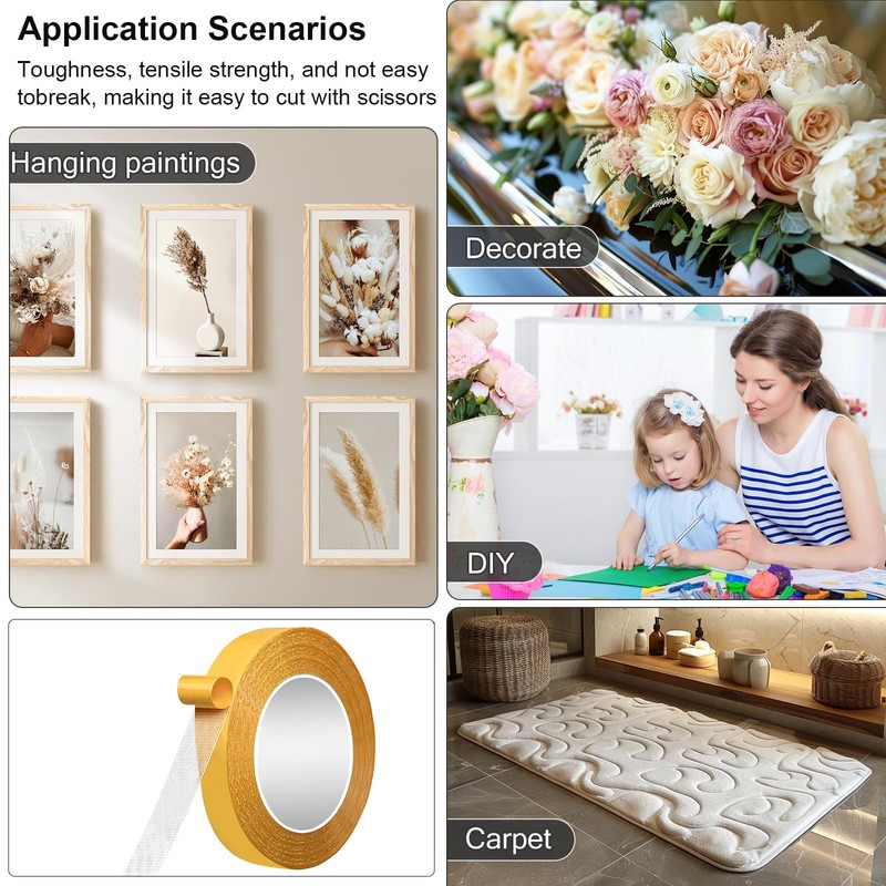 - Multi -function is widely used: our double -sided tape is suitable for various occasions, including family, offices, schools, hospitals and cinemas. It is suitable for paste heavy items, such as carpets, refrigerators, door pads, car cushions, etc., and it is suitable for wood, tiles, glass, marble, aluminum frames, metal, PVC, plastic and other surfaces (note that it is not applicable)