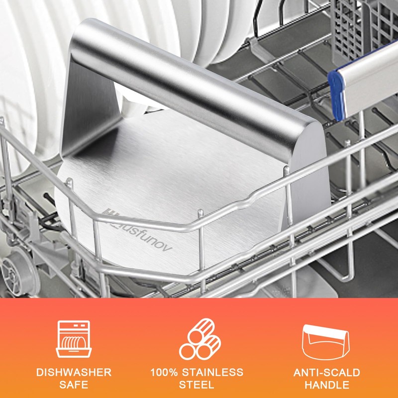 - EASY TO CLEAN:Polished stainless steel has a smooth surface that prevents sticking and keeps patties intact, and is stain and rust resistant.Cleaning is easy, just wash with soapy water and air dry. It can also be easily cleaned in the dishwasher.