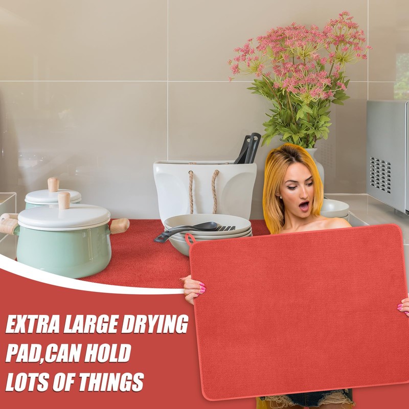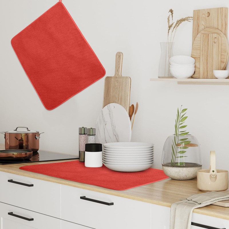 • Reliable Material and Attractive Design: get the ideal balance of functionality and style with our kitchen drying mats for dishes; Made from microfiber, these mats exhibit impressive water absorbent property, ensuring a dry, clean countertop; Their pleasing red color will effortlessly blend with most kitchen interior, enhancing its aesthetics