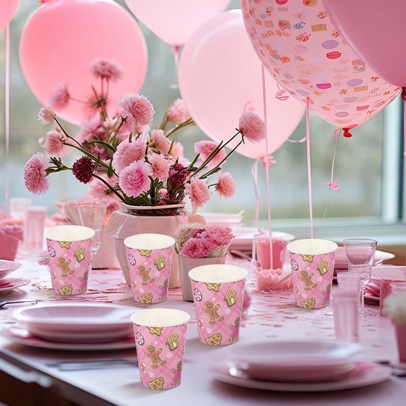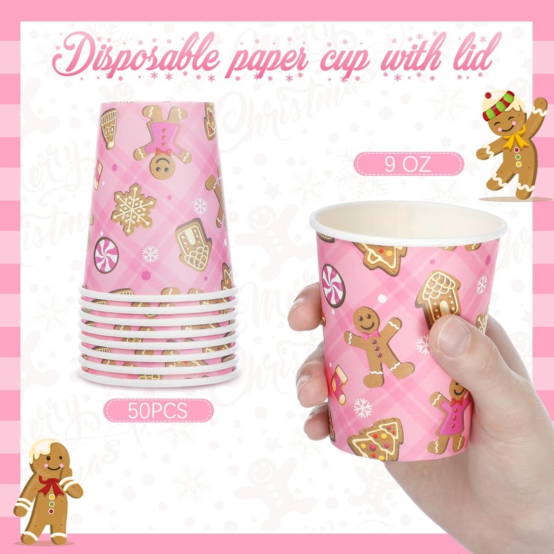 Hushee 50 Pcs Pink Gingerbread Man Party 9 Oz Disposable Christmas Cups Christmas Paper Cups Christmas Coffee Cups Drinkware for Drinking Tea Hot Cold Beverage Holiday Xmas Decoration Supplies
