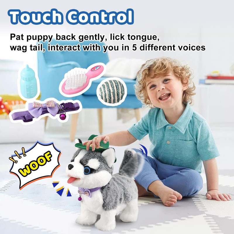 - New Walking Husky Dog Set:Newly walking husky dog toy is different from ordinary dog toys. Walking with leash hat, singing and licking, barking, wagging and nodding, it learns to talk like a real puppy. Gently pat it on the head, woof woof, friendly and positive interaction. A great toy dogs for kids!