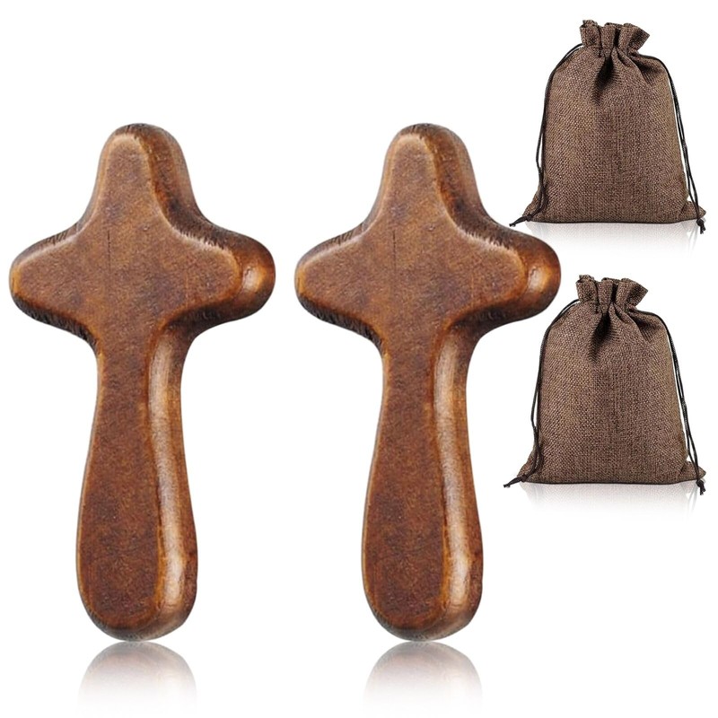 HUSOUE Wooden Cross, 2PCS Mini Olive Wood Holding Cross Comfort Hand Held Crosses Pine Crucifix with Portable Pocket for Kids Adults Religious Christian Prayer Meditation (Brown)