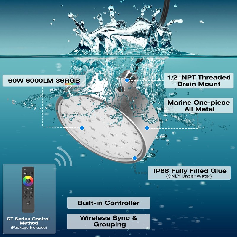 HUSUKU GT8 6000LM RGB Underwater Drain Plug Light for Boat, 1/2" NPT Marine Color Lights Kit, 36LED 12V 60W IP68 Brilliant Lighting in Minutes Wireless Grouping & Control Auto Sync(1 Light, 1 Remote)