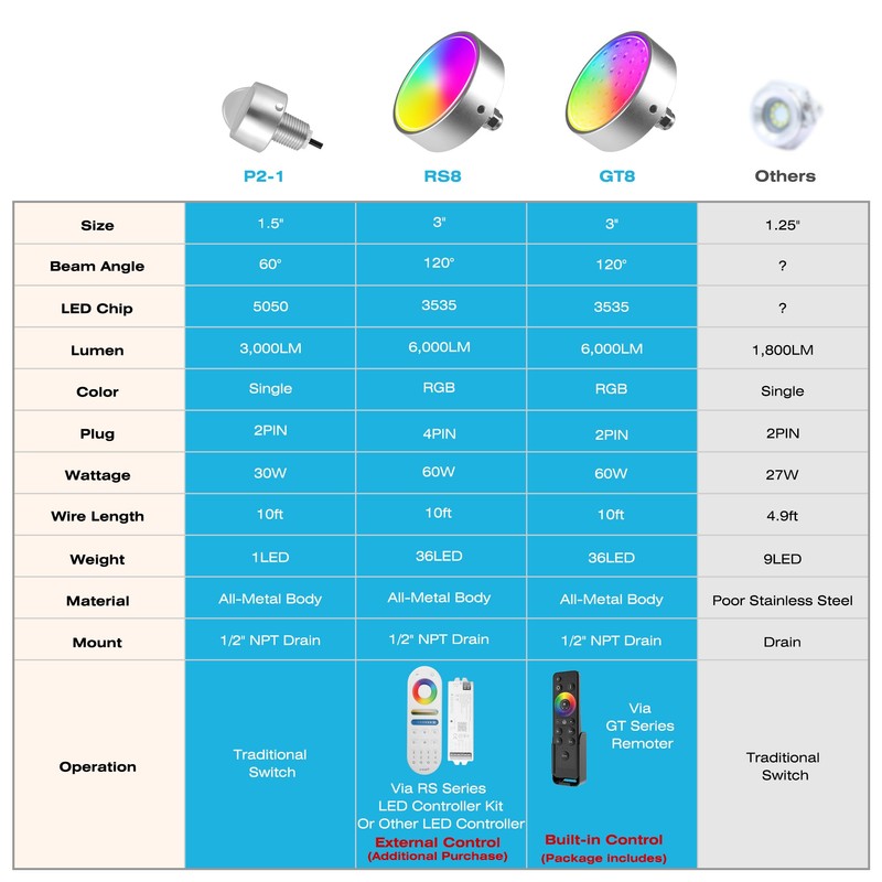 • ULTRA-EASY INSTALLATION: 2-Wire Plug-and-Play System. Designed for all standard 1/2" NPT drain plugs, this light replaces your existing drain plug effortlessly. No drilling or wiring is required—just twist into the thread. Power on each group of lights and pair them with the remote control respectively. Then just install it like a single-color light, you can control all the lights in groups, it's really easy and charming