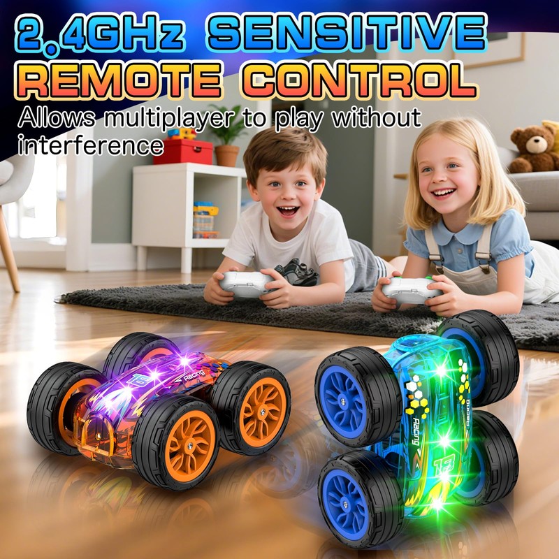 - 360° Rotating, Double-sided Driving. This remote control car performs multiple stunts like moving forward, backward, walking sideways, and rotating in 360°. The smart auto-flip technology allows this rc car to drive on both sides, it flips to drive and pass obstacles easily - making it play without any restriction.