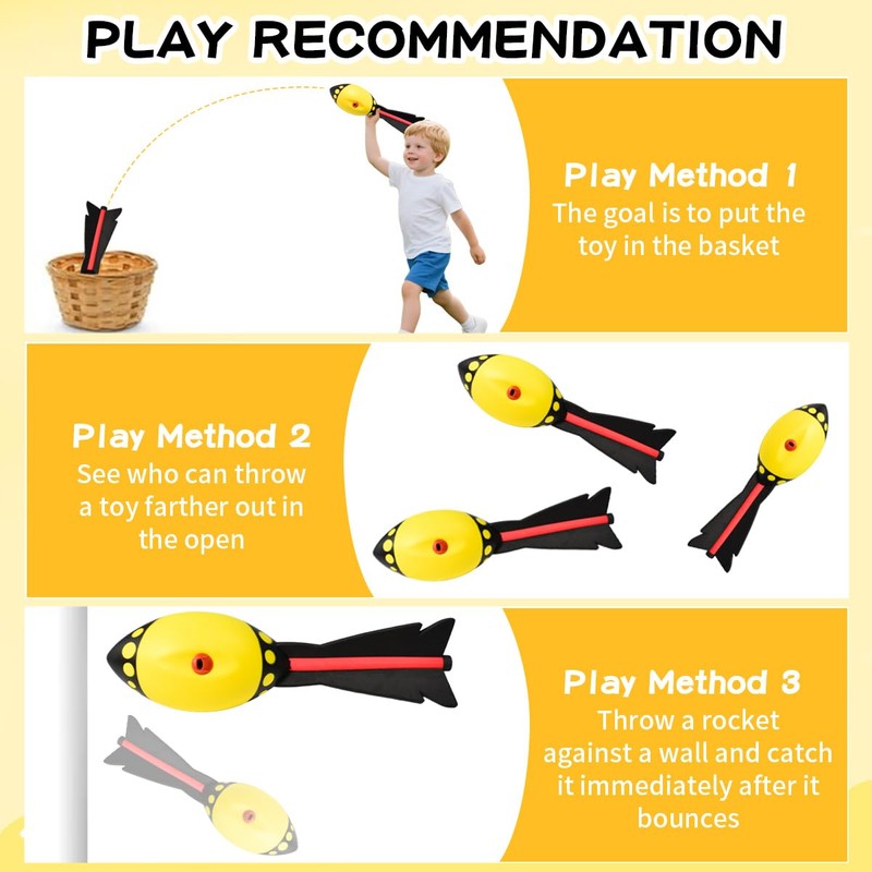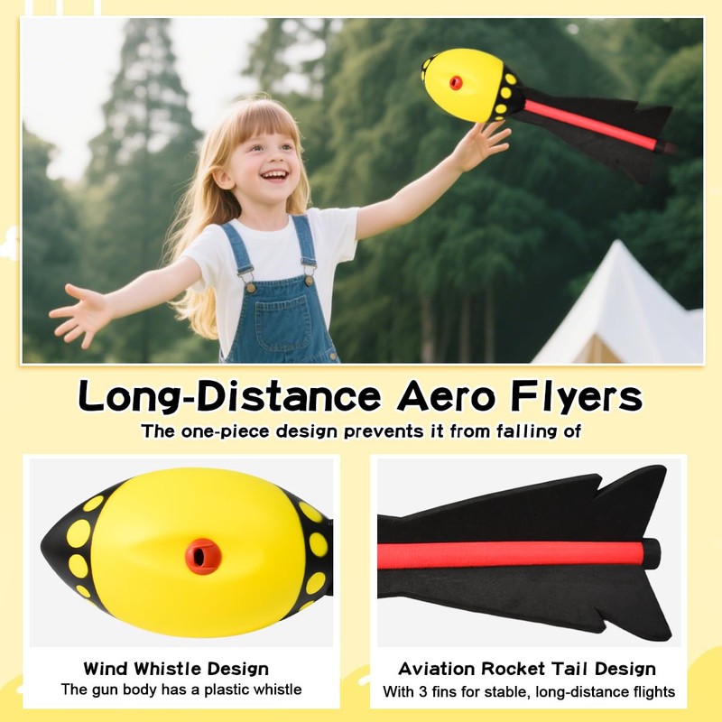 - EVA rocket-shaped rear, long-distance flight: the rear of the whistling javelin thrower is designed according to aerodynamic principles and ensures a longer and more stable flight than models without this feature. The one-piece design prevents parts from peeling and increases durability. Children have fun throwing toys.