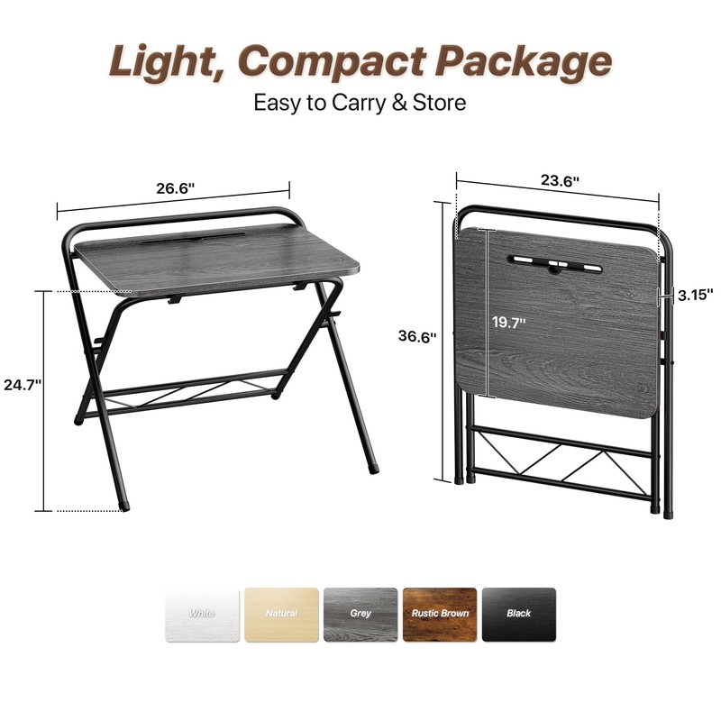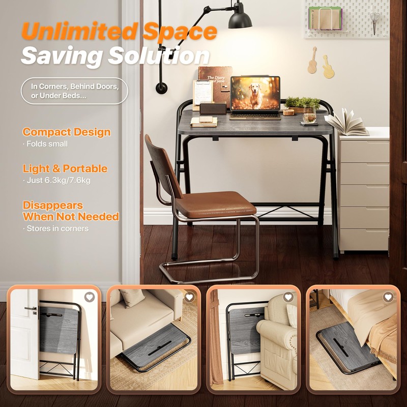 - 【Compact, Foldable & Space-Saving】Perfect for small spaces! Fold Size: 3.15'' X 26.6''X 36.6''. This lightweight foldable computer desk tucks neatly under beds, behind sofas, against walls, or in closets, small dorm. When you need more room, simply fold this office desk up and store it away. Ideal for maximizing your space