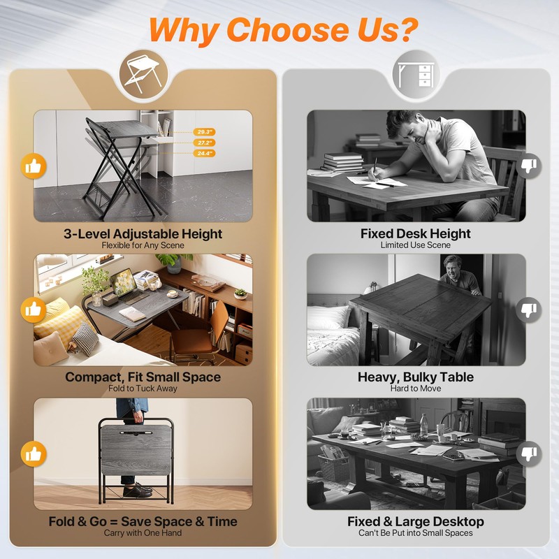 - 【Sturdy & Durable Build】Strong steel frame, adjustable feet, and cross-leg design of the portable folding desk provide exceptional stability. The water-resistant, scratch-resistant tabletop blends seamlessly with any home decor — perfect for bedrooms, apartments, RVs, offices, and more