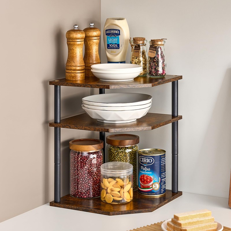 Huukhuom Wooden 3-Tier Corner Shelf, Kitchen Countertop Organizer Counter Stand Storage for Desktop Living Room Bedroom Bathroom Small Space