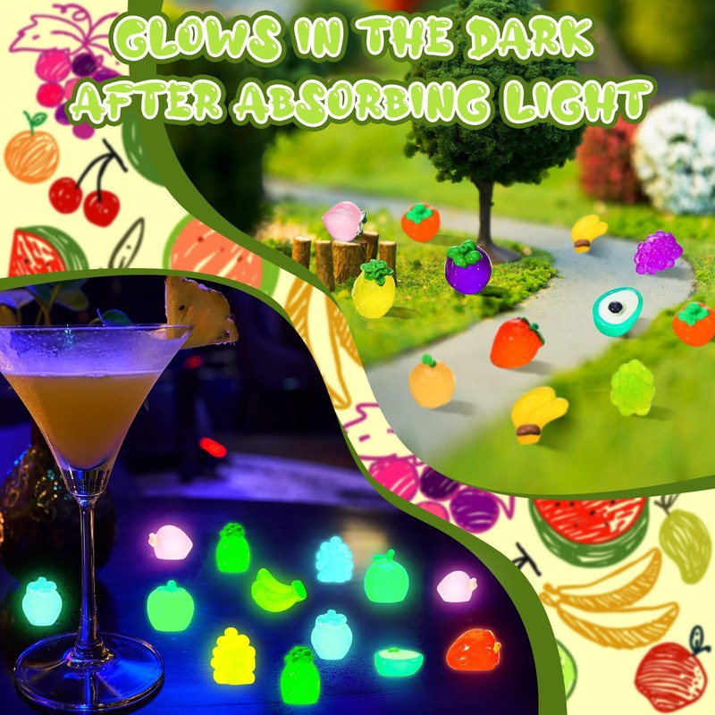 - Luminous Feature: these mini resin luminous fruits glow in the dark when illuminated by light, bringing a charming ambience to your space, making them ideal for decorating your home, school and party, or stuffers of treasure chest or stocking, offering an enchanting visual feast