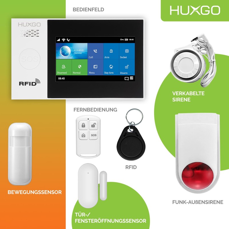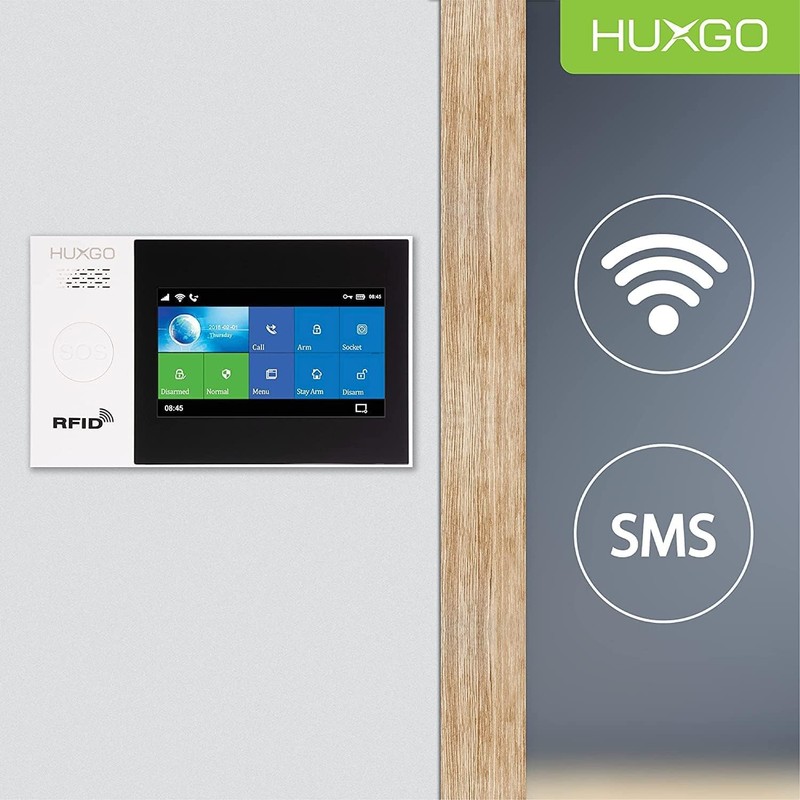 HUXGO® HXA007 Wireless Alarm System Set WiFi + GSM with Siren, Alarm System with Motion Sensor, 5 x Door Window Sensors, Remote Control, Motorhome Alarm System, Alexa Google Home