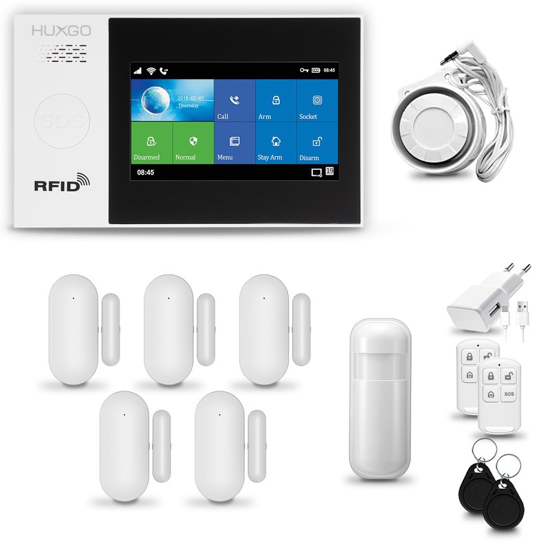 - SET: control panel, internal wired alarm siren, 1x PIR motion sensor, 5x door opening detector/window alarm, 2x remote control, 2x RFID key fobs, power supply, batteries, installation accessories. The set can be extended to 99 sensors.