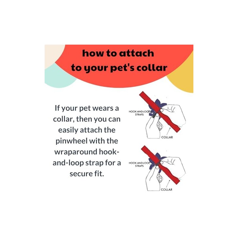 - Versatile and Adjustable Fit - Huxley & Kent's pinwheels are designed with a convenient hook and loop attachment, ensuring a perfect fit for any size collar. This adjustable feature allows pet owners to easily attach and remove the pinwheel, making it a versatile accessory for both dogs and cats, regardless of their collar size. Available in two sizes—Small: 2.5", and Large: 3.5"—thesepinwheels cater to pets of all sizes.