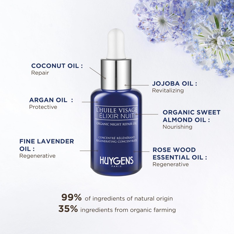 HUYGENS - Elixir Night Oil - Certified Organic - 15mL - Night Repair Oil - Regenerating Concentrate - 100% Natural - Vegan - Made In France