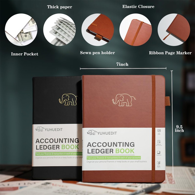 HUYUEDIT Accounting Ledger Book,Book Keeping Log for Small Business & Personal,Ledger Books for Bookkeeping,Accounting Notebook for Expense Tracker Hardcover 9.5x7" (Brown)
