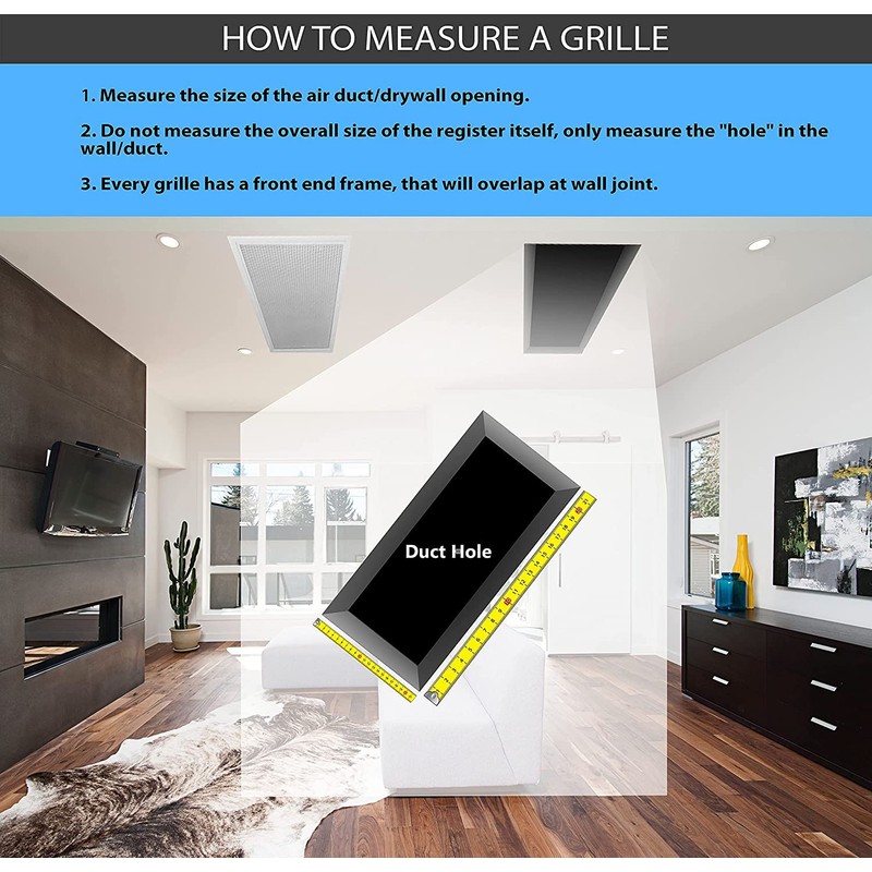 Measure the size of the air duct/drywall opening. Do not measure the overall size of the register itself, only measure the "hole" in the wall/duct. Every grille has a front end frame that will overlap at the wall joint. The total outer size of this grille is the listed size plus 2".