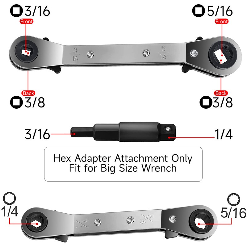 - Hvac Service Wrench Tools Set: you will receive a refrigeration repair wrench set including 2pcs Hvac ratchet wrench(Large wrench is available in 1/4", 3/8", 3/16" and 5/16", and small wrench is available in 1/4" and 5/16".), 2pcs hexagon bit adapter. Excellent Hvac tools for HVAC repair technology, compatible with air-conditioning, refrigeration and other equipment.
