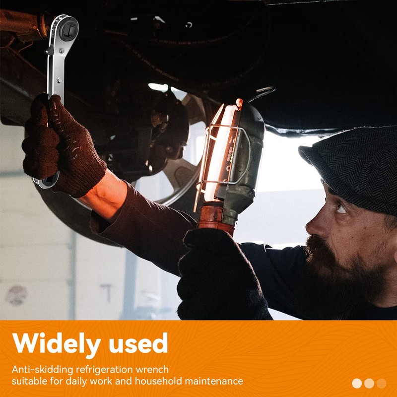 - Easy to Use: Refrigeration service wrench, 4.6" and 5.47" in length, compact in size, easy for hand holding, anti-skidding refrigeration wrench, thus you can work comfortably and labor-saving. The double end of wrench has a quick flip steering lever, NO need to be removed all the time for automatic adjustment. The curved design is suitable for narrow spaces and increases work efficiency.