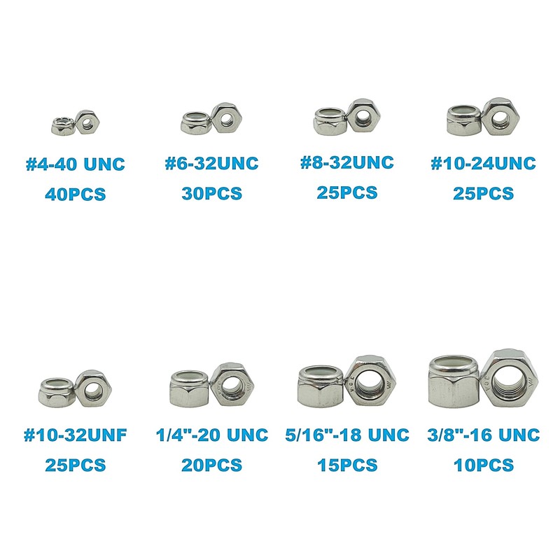 - The assortments contain the following sizes and quantity:#4-40 UNC(40PCS);#6-32 UNC(30PCS);#8-32 UNC(25PCS);#10-24 UNC(25PCS);#10-32 UNF(25PCS) ;1/4"-20 UNC(20PCS);5/16"-18 UNC(15PCS);3/8"-16 UNC(10PCS), Total 190 piece