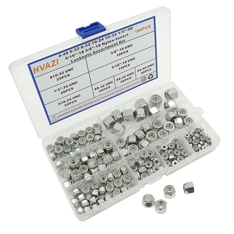 190pcs 8 kinds #4-40 NUC #6-32 NUC #8-32 NUC #10-24 NUC #10-32NUF 1/4"-20 NUC 5/16"-18 NUC 3/8"-16 UNC Hex Nylon-Insert Locknuts Assortment Kit;Come with the plastic box: