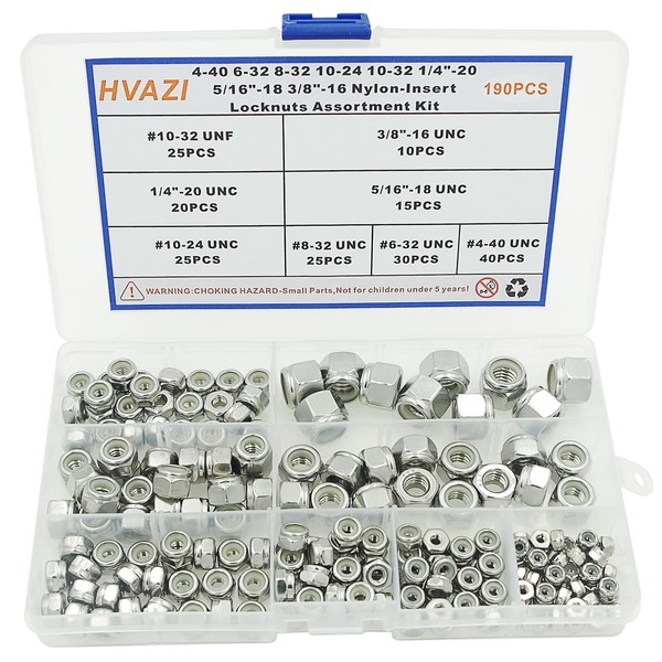HVAZI 190PCS 8 Kinds #4-40 to 3/8"-16 304 Stainless Steel sae Hex Nylon-Insert Locknuts/Elastic stop nuts Assortment kit Packed in a plastic box