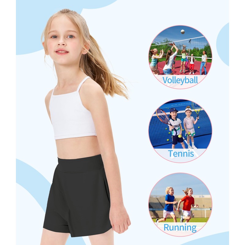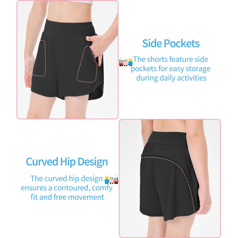 These girls' athletic shorts blend functionality, comfort, and style, ideal for active young athletes. The high-waist with an elastic waistband offers a secure fit and tummy coverage, preventing sliding during intense activities. The innovative double-layer design features an inner brief for extra coverage and chafing prevention, boosting confidence during sprints or soccer games. Crafted from 90% polyester and 10% spandex, they're soft, lightweight, and use moisture-wicking tech to keep kids dry during workouts. The 4-way stretch fabric allows full mobility for yoga, basketball, or playground fun. Dual side pockets are deep enough for keys, hair ties, or a phone, staying secure during movement. Versatile for sports events or casual wear, pair them with tank tops for gym or tees for weekends in various colors. Machine washable for convenience, avoid bleach to maintain quality. Refer to the size chart for the perfect fit, combining comfort, performance, and durability for daily active use.
