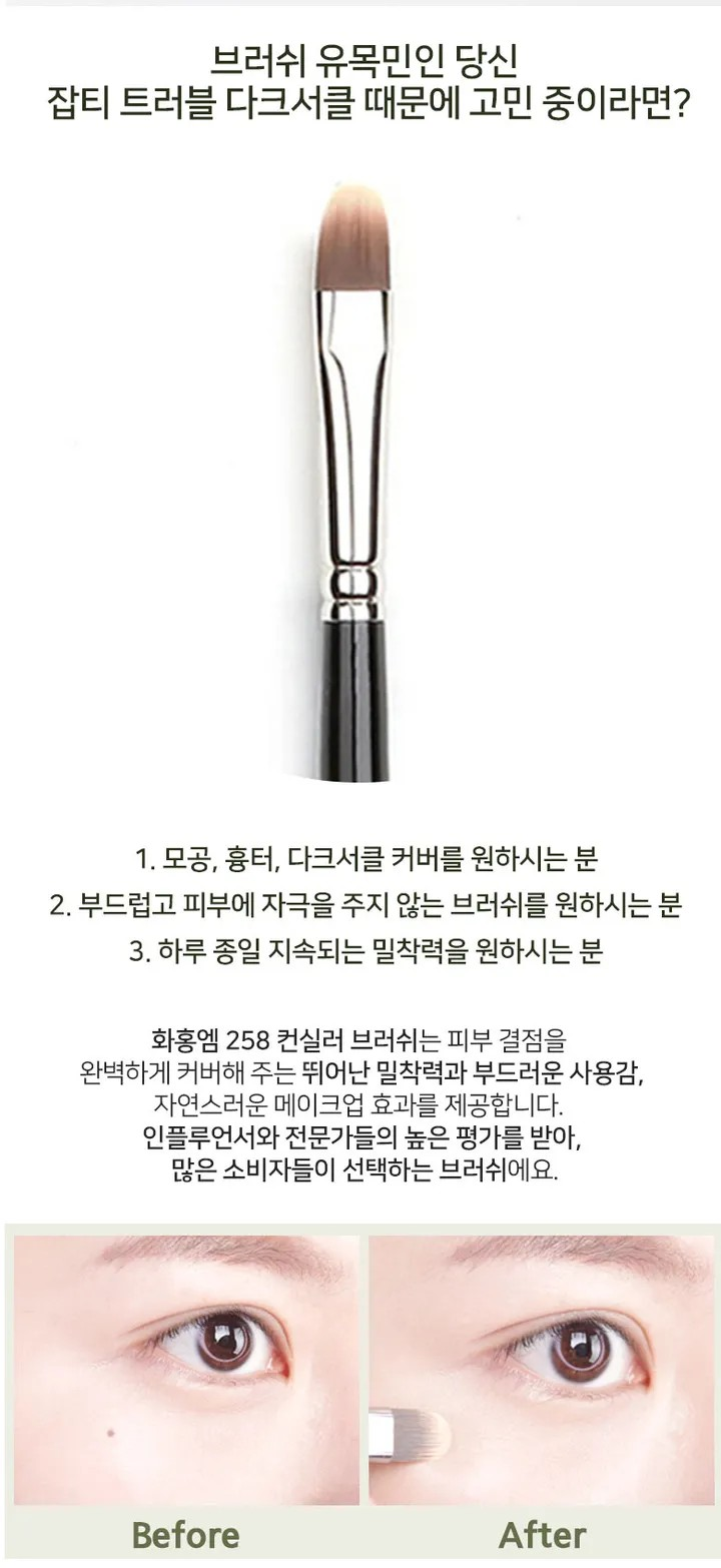 A product highly recommended by a beauty YouTuber with 1.5 million subscribers. [258 Brush] A steady-selling product of Hwahong M recommended by a beauty YouTuber. Provides excellent coverage of skin flaws and adhesion. The wide brush hair provides perfect coverage of freckles, blemishes, dark circles, nose, and pores. The detailed cutting technology of Hwahong M provides thorough coverage. Provides multi-use to apply detailed base and cream shadow. [156 Brush] Provides perfect coverage of dark circles. The long slim shaped brush provides perfect coverage of dark circles. The soft feeling of application is non-irritating on sensitive and weak eye area. The flawless brush designed with sharp edge provides detailed coverage of small blemishes and scars. The thin and long hair provides detailed coverage of narrow areas.