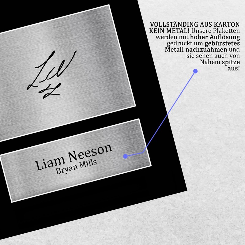 Professionally made in our studio, this unframed Liam Neeson A4 (297x210mm) display is an ideal gift idea. This laser printed quality photo is stretched on an acid-free matte black display board with three windows. To the left of the display is the main image. To the right of the display are two metallic effect badges for printed copies of the name and autograph signature. These brackets also have a fixed backboard which makes them very sturdy and so can be displayed or hung. If you want to frame them, they will fit into any A4 frame. Alternatively, we also offer a framed version. Lightweight but of the highest quality, the ideal Christmas/birthday gift for fans of all ages.