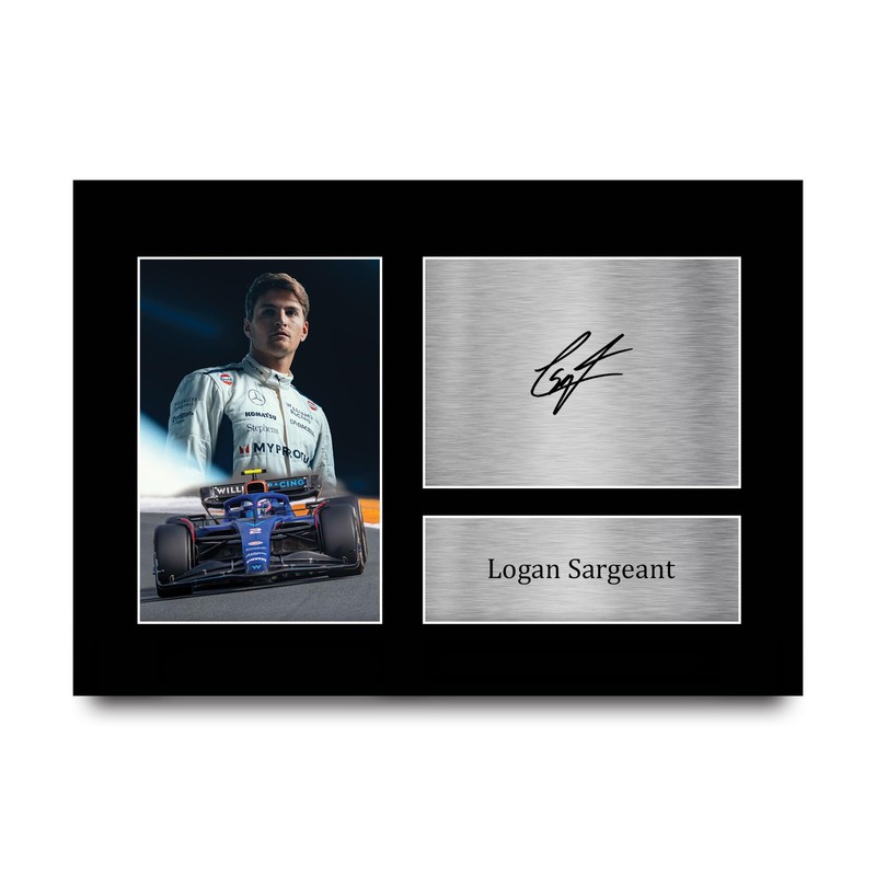 Professionally made in our studio, this A4 (297x210mm) unframed Logan Sargeant Williams display makes for an ideal gift idea. This laser printed quality photograph is mounted in a precision cut three windowed acid-free matt black display board. To the left of the display there is the main image. To the right of the display there are two metallic effect plaque areas for printed copies of the name and autograph signature. These mounts also come with a ridgid backing board making them very sturdy and can be displayed or hung as they are. If you wish to frame them they will fit in any A4 Frame. Alternatively we offer a framed version too. Lightweight, but of the highest quality, these make the ideal Christmas/Birthday gift for fans of all ages, and best of all, they definitely won't break the bank!