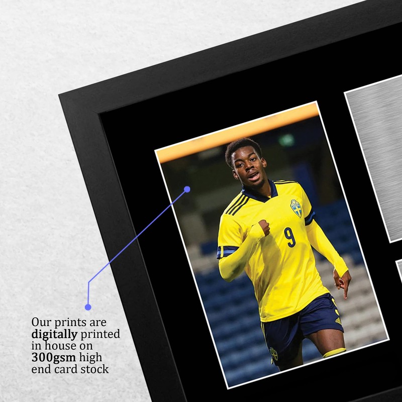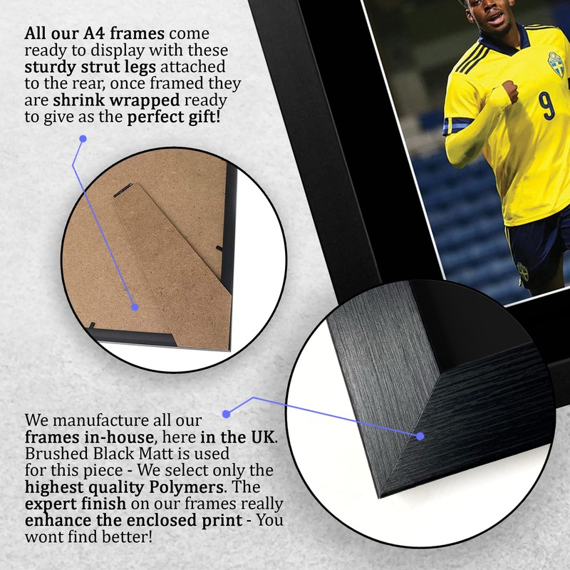 Professionally made in our studio, this A4 (330x245mm) framed Anthony Elanga display makes for an ideal gift idea. This laser printed quality photograph is mounted in a precision cut three windowed acid-free matt black display board. To the left of the display there is the main image. To the right of the display there are two metallic effect plaque areas for printed copies of the name and autograph signature. This display comes ready framed in a sleek black polycarbonate frame that compliments the matt mount display and a clear perspex front to keep it dust free and clean. Lightweight, but of the highest quality, these make the ideal Christmas/Birthday gift for fans of all ages, and best of all, it definitely won't break the bank!