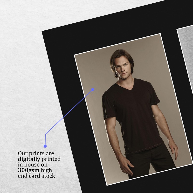 Professionally made in our studio, this Jared Padalecki display makes for an ideal gift idea. This laser printed quality photograph is mounted in a precision cut three windowed acid-free matt black display board. To the left of the display there is the main image. To the right of the display there are two metallic effect plaque areas for printed copies of the name and autograph signature. These mounts also come with a ridgid backing board making them very sturdy and can be displayed or hung as they are. Alternatively we offer a framed version too. Lightweight, but of the highest quality, these make the ideal Christmas/Birthday gift for fans of all ages, and best of all, they definitely won't break the bank!