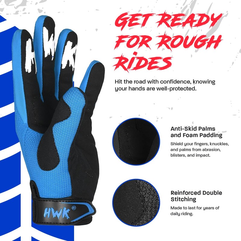 • Crash Proof Comfort. Ride with fearless confidence! Our riding gloves feature a shock-resistant anti skid palm and 3D silicone HWK logos, offering top-notch crash protection and cut prevention.
