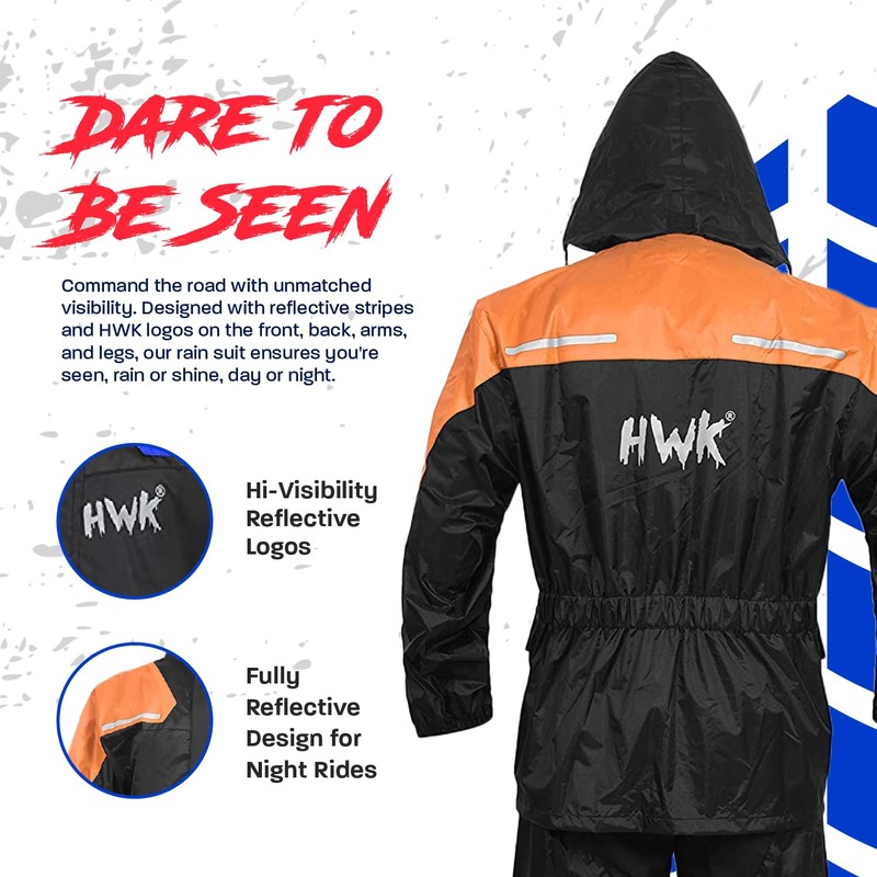 - Hi Vis Riding. The motorcycle rain suit comes with reflective stripes and HWK logos on the front, back, arms, and legs, keeping you highly visible in low light and bad weather conditions